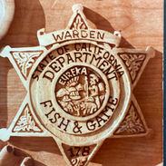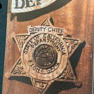 A couple of signs I have kept for myself, the sheriffs badge was the number I had carried as a deputy. There is a tree made of solid oak I cut as a new deputy that I have kept. You can see it in the furniture photos on top of a book case. The tree was shown at a city art show, and the Mayor asked if I would donate it to a Russian sister city? I asked if I would get to go and present it, she said no, and so did I.